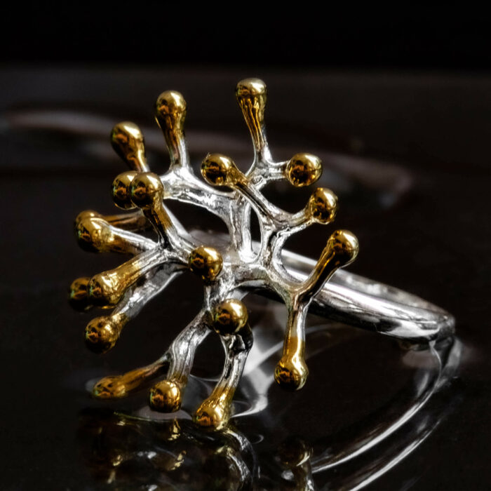 This Psammocora ring made of gold-plated 925 Sterling Silver and is inspired by the stony corals of the Psammocoridae family, which are also known as cat’s paw corals. The family contains one single genus comprised of yet nine described species, many of which are categorized as threatened with extinction, and very common to find in the Eastern Pacific Tropical rocky reefs.
